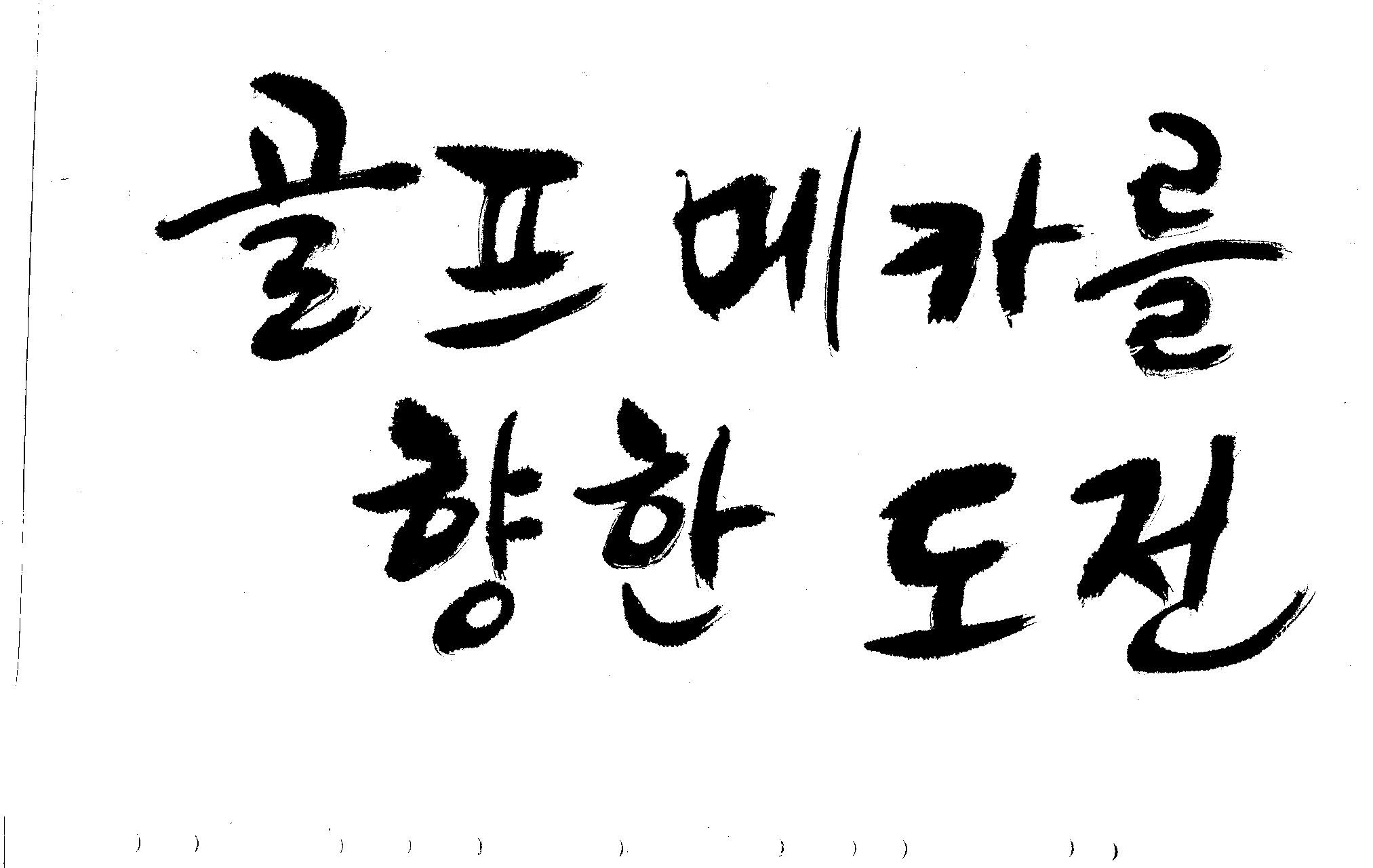 우경의 행복한 캘리세상-골프메카 김철호 일반 0 8689 2009.07.18 10:25 리듬감을 최대한 살리고 ㅡ 스포츠의 운동감과 밝음 기교섞인 획을 배제--일반적인 느낌 굵기변화를 통하여 도전 낱말을 강조 스타일은 비슷하지만 ...한 사람이 썼으니까 ㅎㅎㅎ 서로 다른 글꼴을 올린 것은... 비교하여 보시고... 편집자에게 선택권을 주는 것입니다