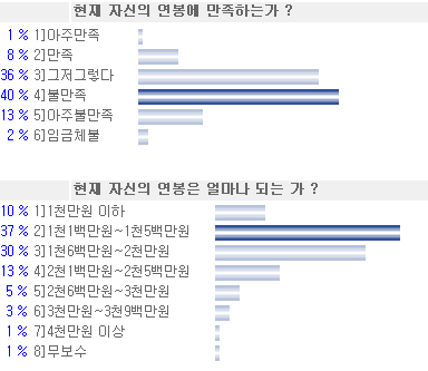 이번 조사에서 밝혀진 국내 디자이너들의 연봉 수준은 약 1천 5백만원 가량으로 1천 1백만원에서 2천만원 대 연봉자가 가장 많은 것으로 조사됐으며, 의외로 4천만원 이상의 고액 연봉자는 전체 응답자의 1%밖에는 차지하고 있지 않아, 국내 디자인업계의 전반적인 불황이 진행되고 있음을 단적으로 보여주고 있기도 하다. <기사발췌>